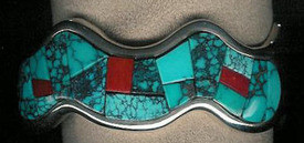 raised inlay stones of turquoise and coral in a zig zag pattern design.
