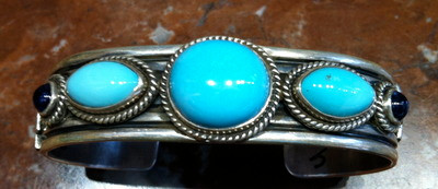 with Iolite and silver overlay. Center turquoise stone is domed round and turquoise stones