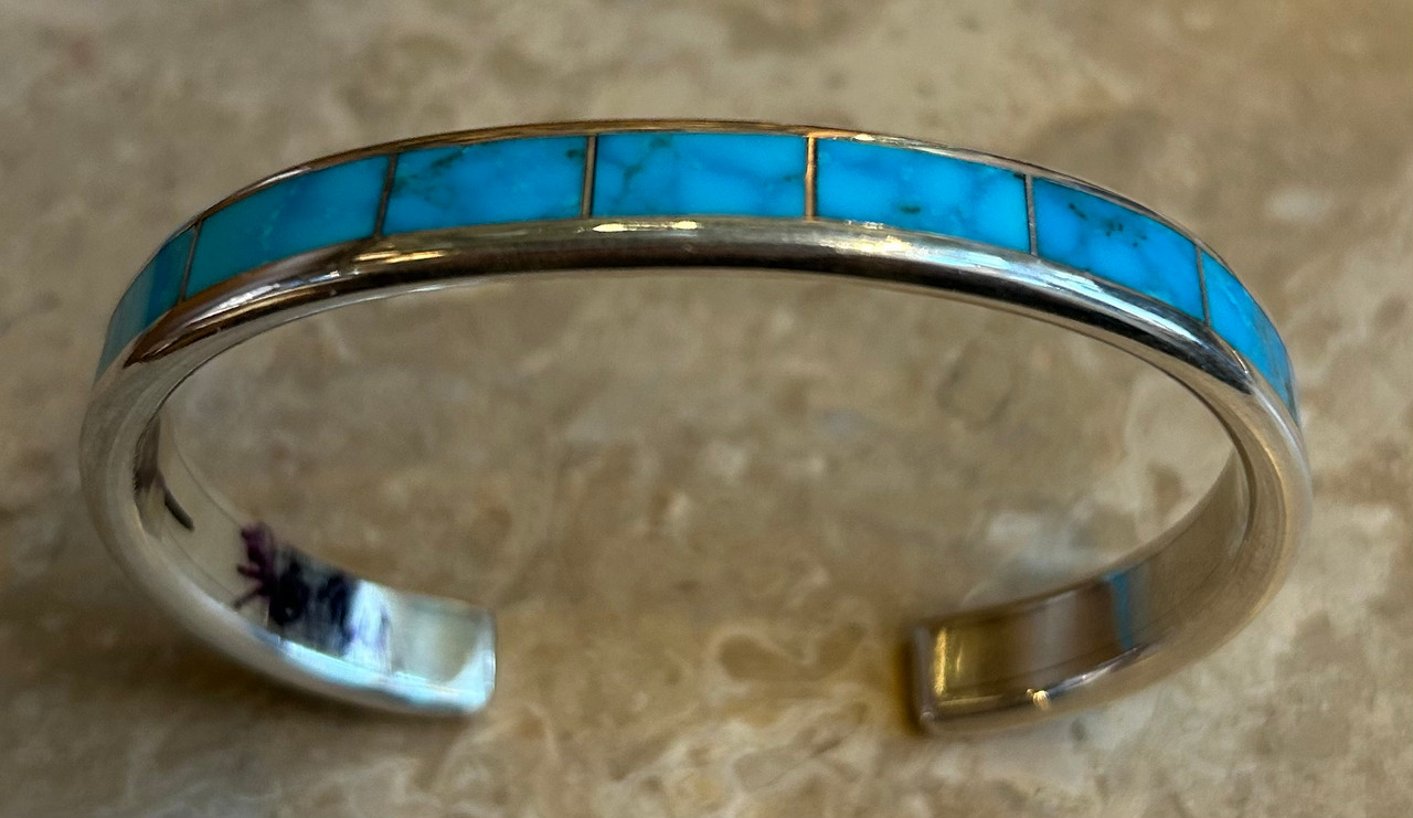 Loading... Please wait...Now listing online for your shopping convenience this gorgeous Blue Gem Turquoise multi-inlay channel bracelet set into sterling silver. This is signed by Larry Loretto, “Loretto” Zuni artist. This bracelet measures all the way around on the inside of the bracelet 6 1/2”. This includes the bracelet's opening as well. Opening measuring it alone measures 1”. Width of this bracelet measures 3/8”W. We can hardly keep these bracelets in the Gallery as they are so popular. These great stones are very hard to come by. Customers are surprised when we tell them that "there is not an endless supply of turquoise out there". Because of it’s vibrant color Blue Gem Turquoise we find through our 43 years of experience that it is very popular. "Buy this Now” and make it yours!