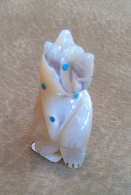 SOLD Joanne Cheama is the artist of this standing bear fetish made of snail shell with turquoise accents.